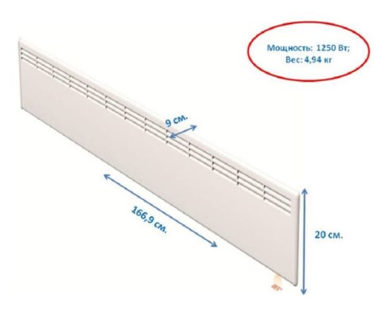 Заданная температура проецируется на пол под устройством. Конвектор укомплектован кабелем (1.5 м.) со штепсельной вилкой, а также он имеет ударопрочные боковые поверхности корпуса.