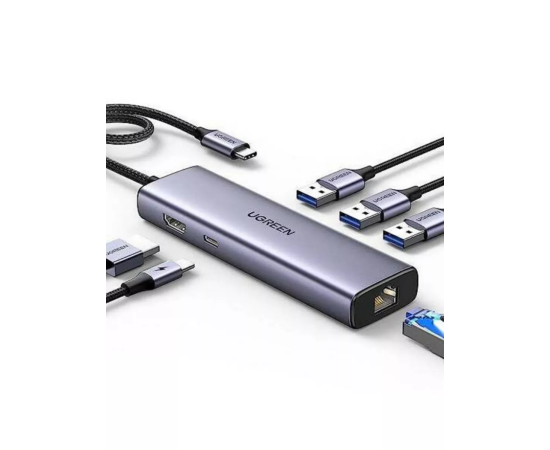 Конвертер UGREEN CM512 15598 USB-C To 3*USB 3.0 A+HDMI+RJ45+PD Converter Gray