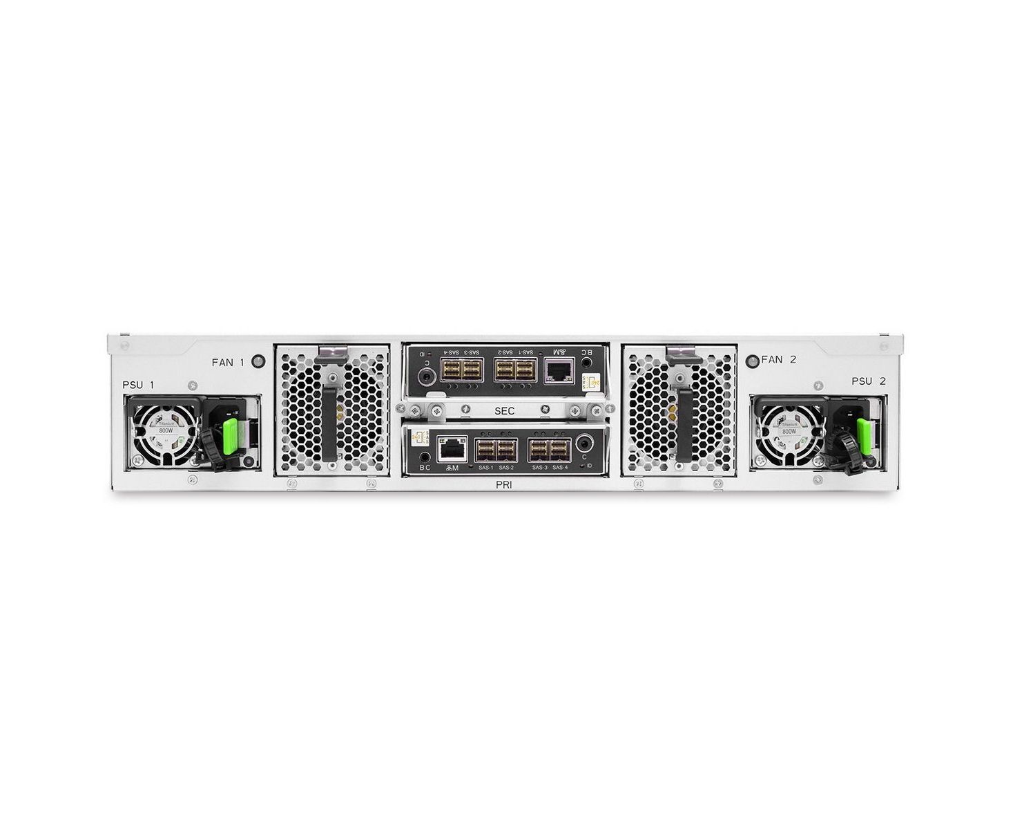 JBOD корпус с двумя SAS 23G контроллерами расширения (LSI SAS4X40) с 4 портами Mini SAS HD (SFF-8674) на каждом модуле. BMC onboard. 2 тыловых HotSwap вентилятора 60x60x56мм
