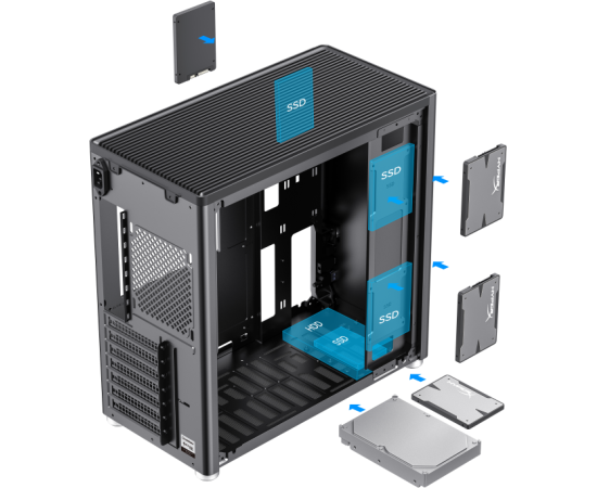2 x 140 мм на верхней панели, 120 мм на задней панели, 2 x 140 мм на нижней панели
