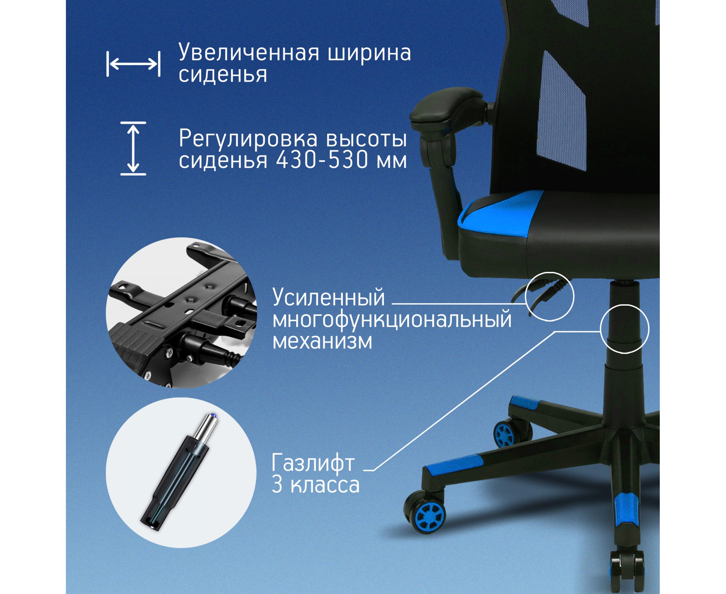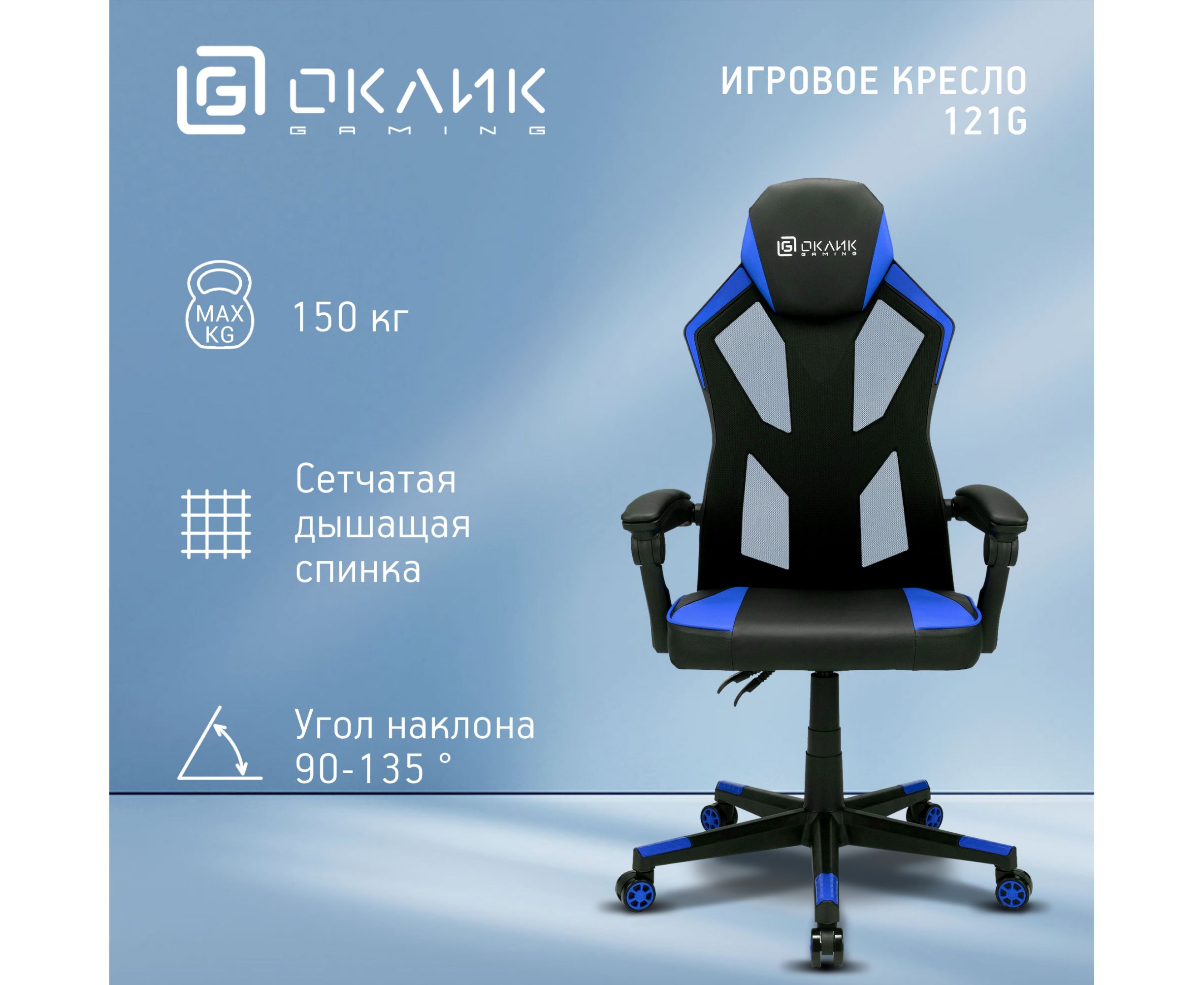 Модель 121G обладает стильным геймерским дизайном. Вставки синего цвета на подголовнике, спинке, сидении и крестовине сделают кресло эффектным элементом в любом интерьере. За счет удобной посадки модель подойдет и для ежедневной работы за ПК.