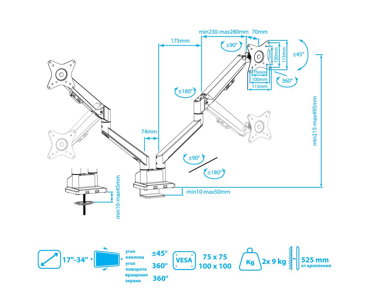 Вид кронштейна: Выдвижной, Наклонный, Поворотный, С перемещением по вертикали, положение панели портрет/альбом