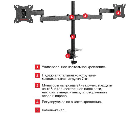Описание Универсальное настольное крепление для 2-х мониторов. Надежная стальная конструкция- максимальная нагрузка 2×7 кг.