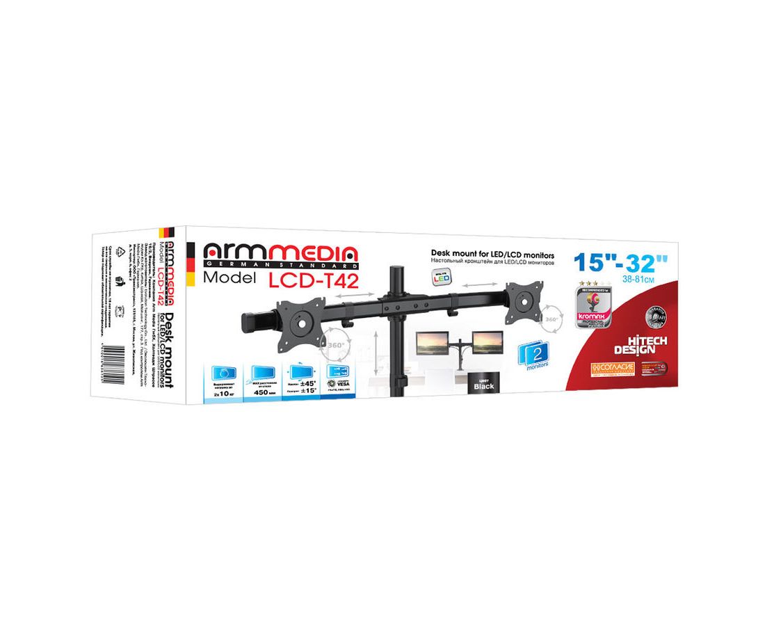 Кронштейн для мониторов Arm Media LCD-T42 черный 15"-32" макс.20кг настольный поворот и наклон верт.перемещ.