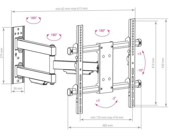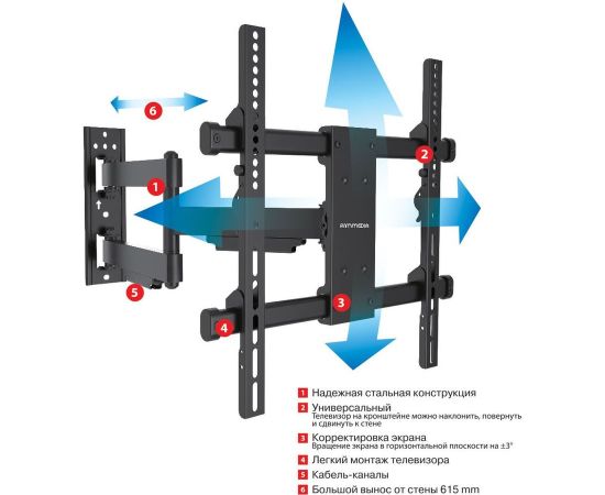 Описание Кронштейн PARAMOUNT-40, для LED/LCD телевизоров 26"-65", max 50 кг, настенный, наклон +3 -10, поворот 180 градусов, от стены 62-615 мм, max VESA 400×400 мм
