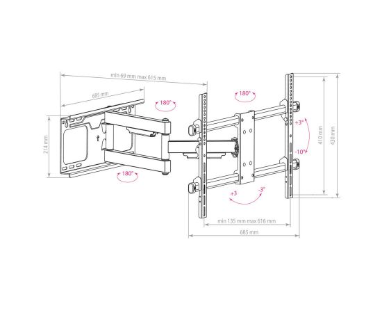 Описание: Надежная стальная конструкция; Универсальный — телевизор на кронштейне можно наклонить, повернуть и сдвинуть к стене; Вращение экрана в горизонтальной плоскости на ±3 градуса; Легкий монтаж телевизора; Кабель-каналы; Большой вынос от стены.