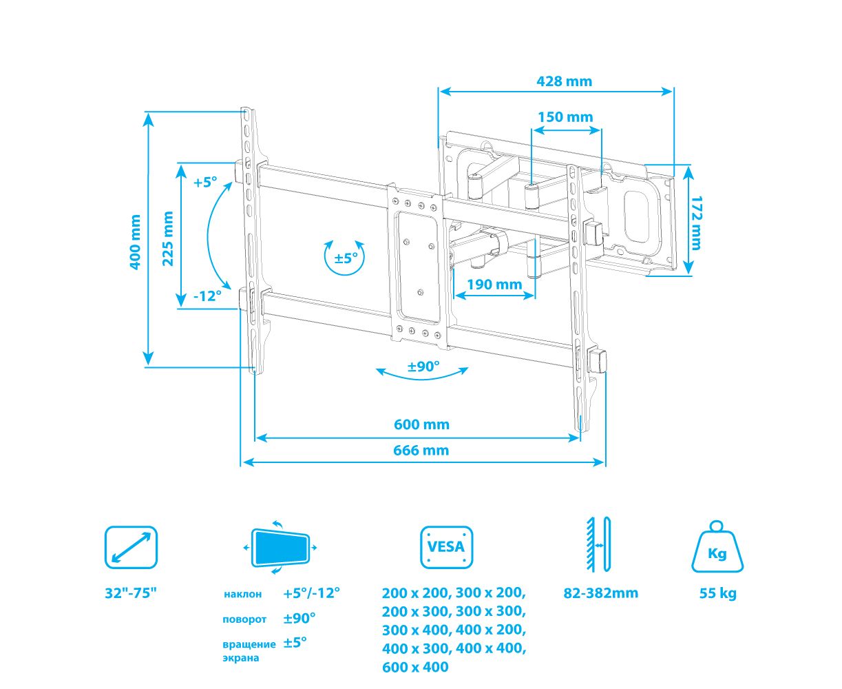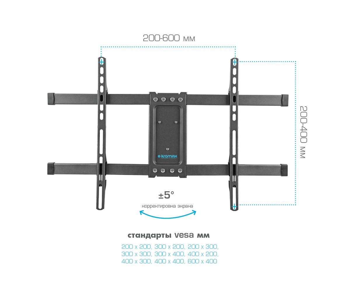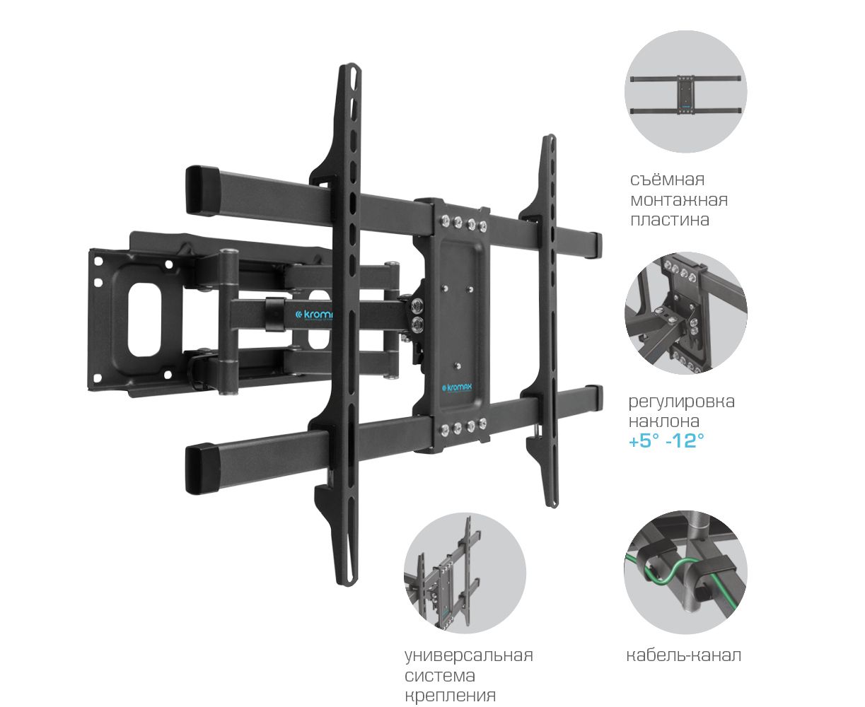 Надежная стальная конструкция максимальная нагрузка до 55 кг, Универсальная система крепления, Легкий монтаж при помощи съемной монтажной пластины, Вращение экрана уникальная возможность вращения экрана на ±5° относительно стены, Кабель-канал
