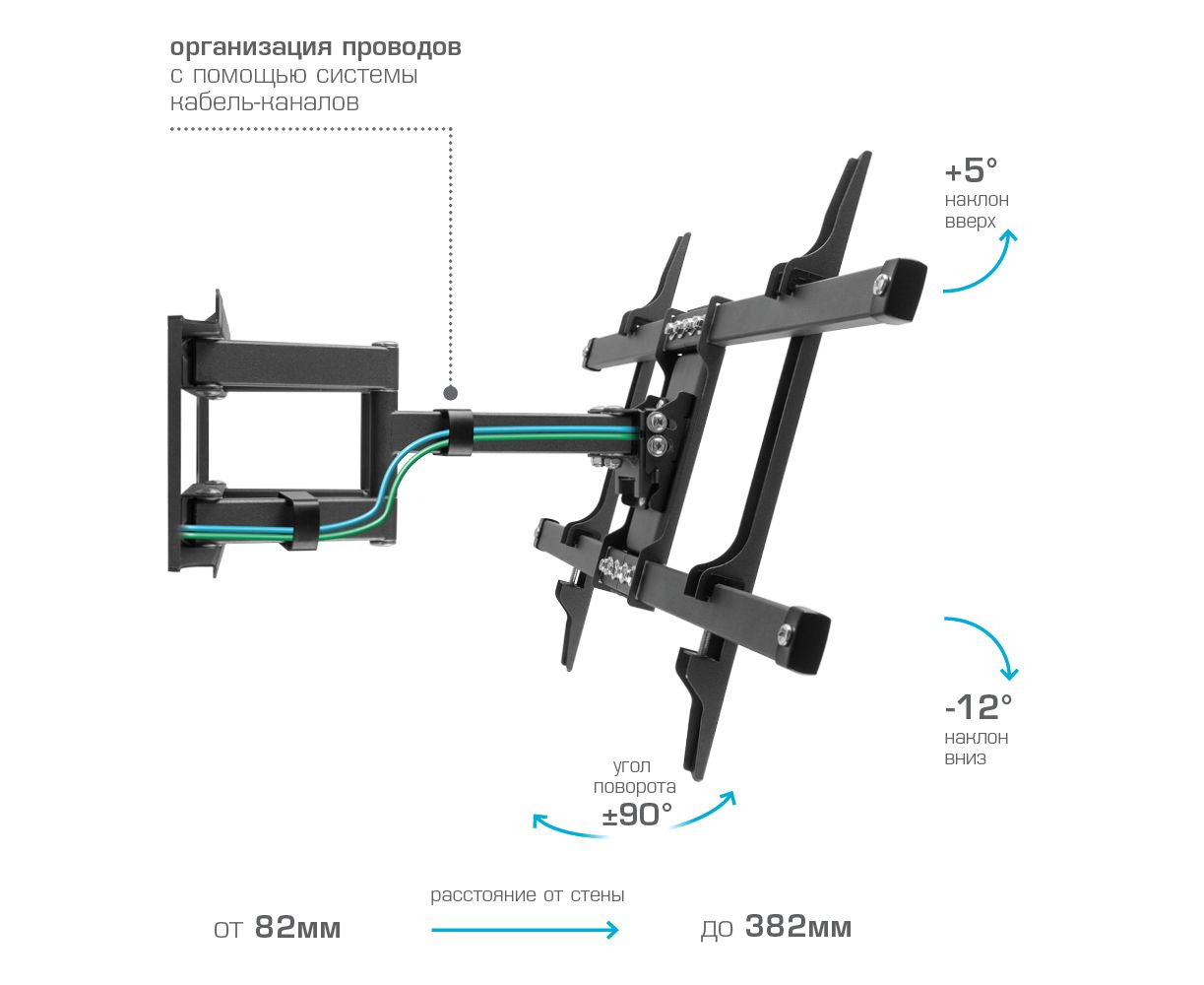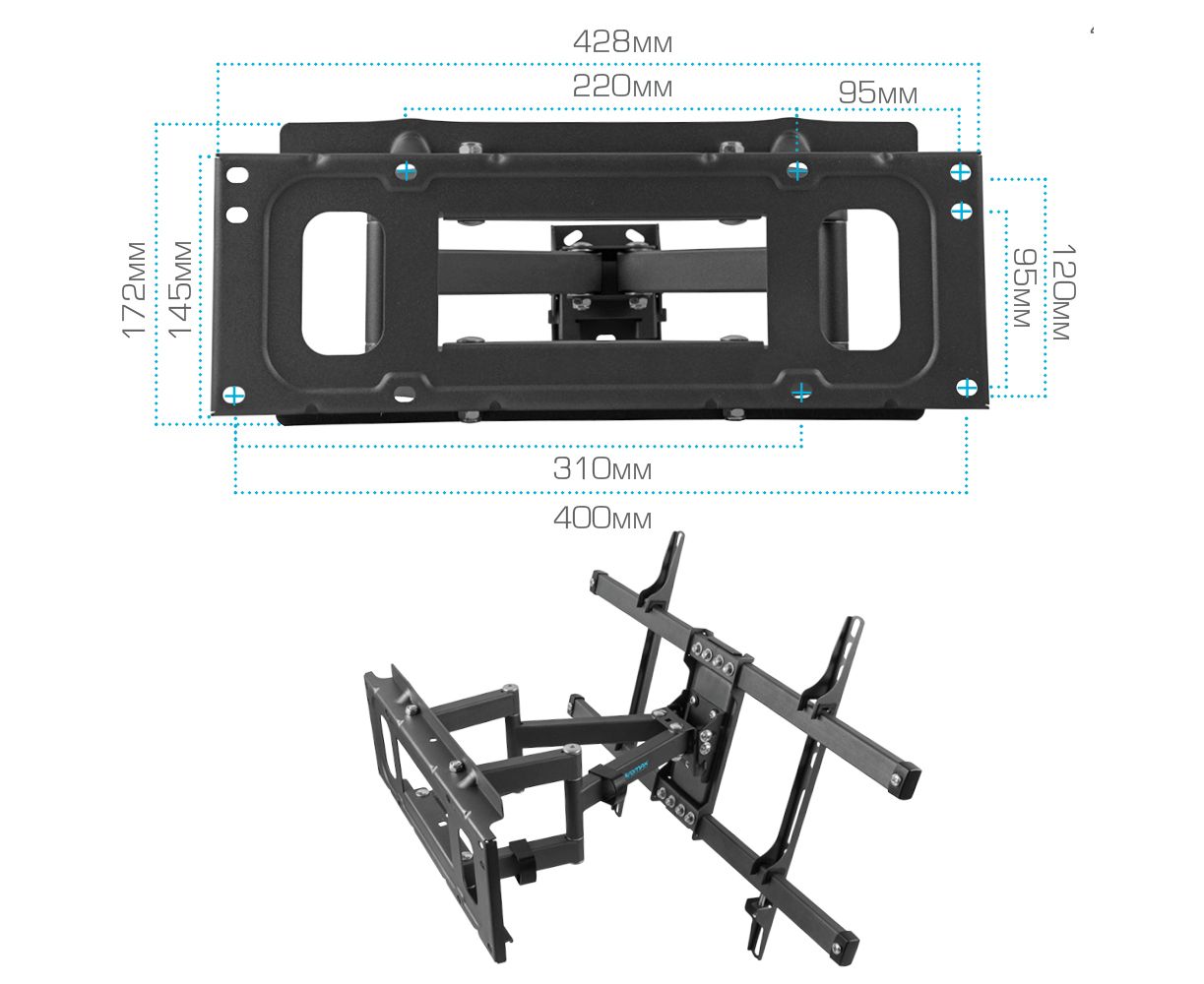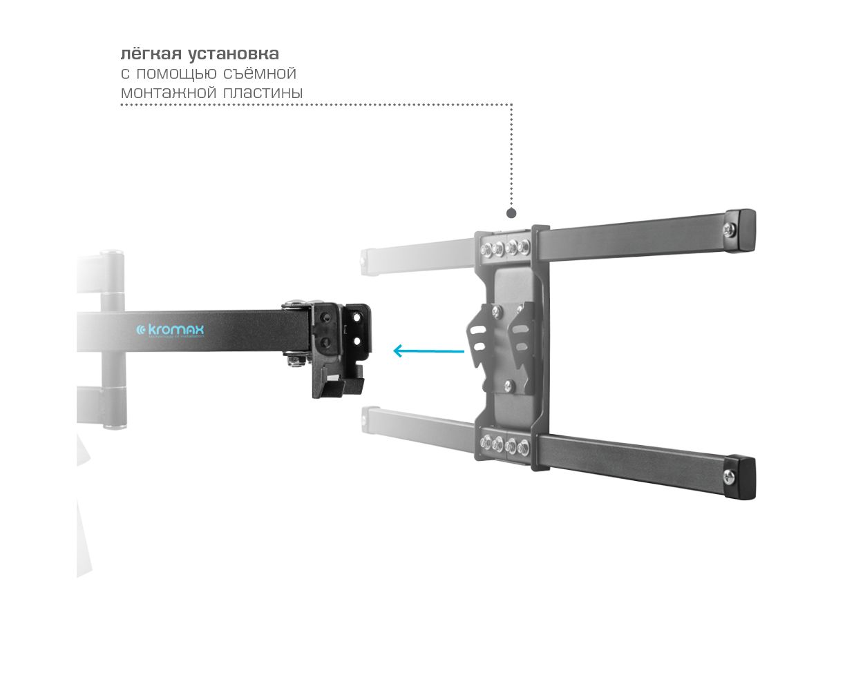 Надежная стальная конструкция максимальная нагрузка до 55 кг, Универсальная система крепления, Легкий монтаж при помощи съемной монтажной пластины, Вращение экрана уникальная возможность вращения экрана на ±5° относительно стены, Кабель-канал