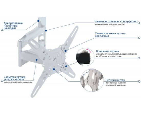 Описание: Надежная стальная конструкция с нагрузкой до 40 кг. Универсальная система крепления. Легкий монтаж при помощи съемной монтажной пластины. Скрытая система укладки кабеля в специальные кабель-каналы. Декоративные настенные накладки.