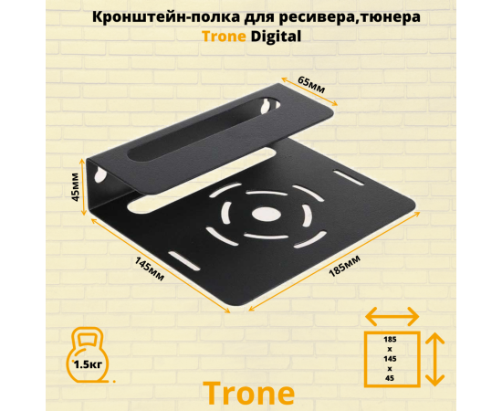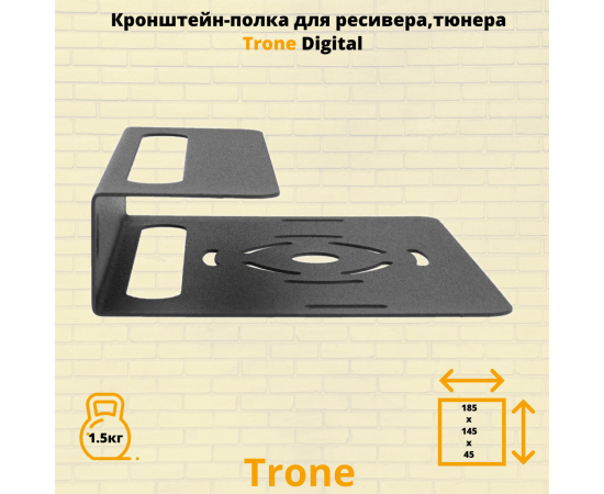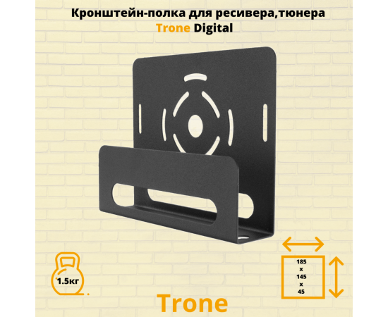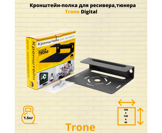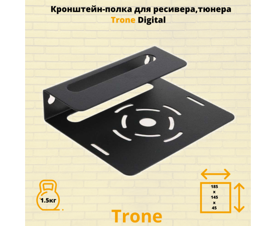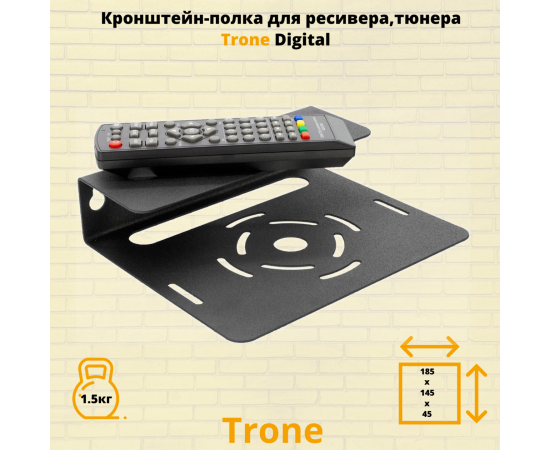 Модель Trone Digital разработана для крепления ресиверов, тюнеров, в особенности учитывает параметры ресивера, так полюбившегося сегодня Триколор ТВ. Универсальная конструкция подходит для большинства DVBT устройств, а так же : blu-ray или DVD плеера , спутникового ресивера небольшого размера. Универсальное применение полки в быту позволяет использовать ее в коридоре, на кухне, в подсобных помещениях, гараже. Кронштейн Trone Digital выдерживает нагрузку до 1.5 килограмма. Расстояние от стены 145 мм. , ширина 185 мм. , высота 45 мм. В верхней и нижней частях полки сделаны отверстия для охлаждения приставки.