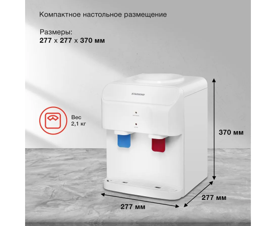 Если в офисе или квартире нет свободного места, данная модель отлично впишется буквально на край стола. При этом устройство полностью функционально, как и его полноразмерные аналоги. Оно подаёт воду, нагретую до 85-95 градусов или комнатной температуры.