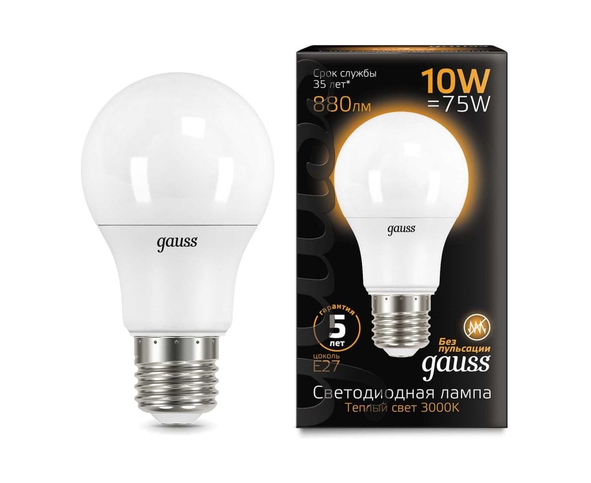 Лампа светодиодная Gauss A60 102502110 10Вт цок.E27 шар 220B 3000K св.свечения белый теплый A60 уп/10шт