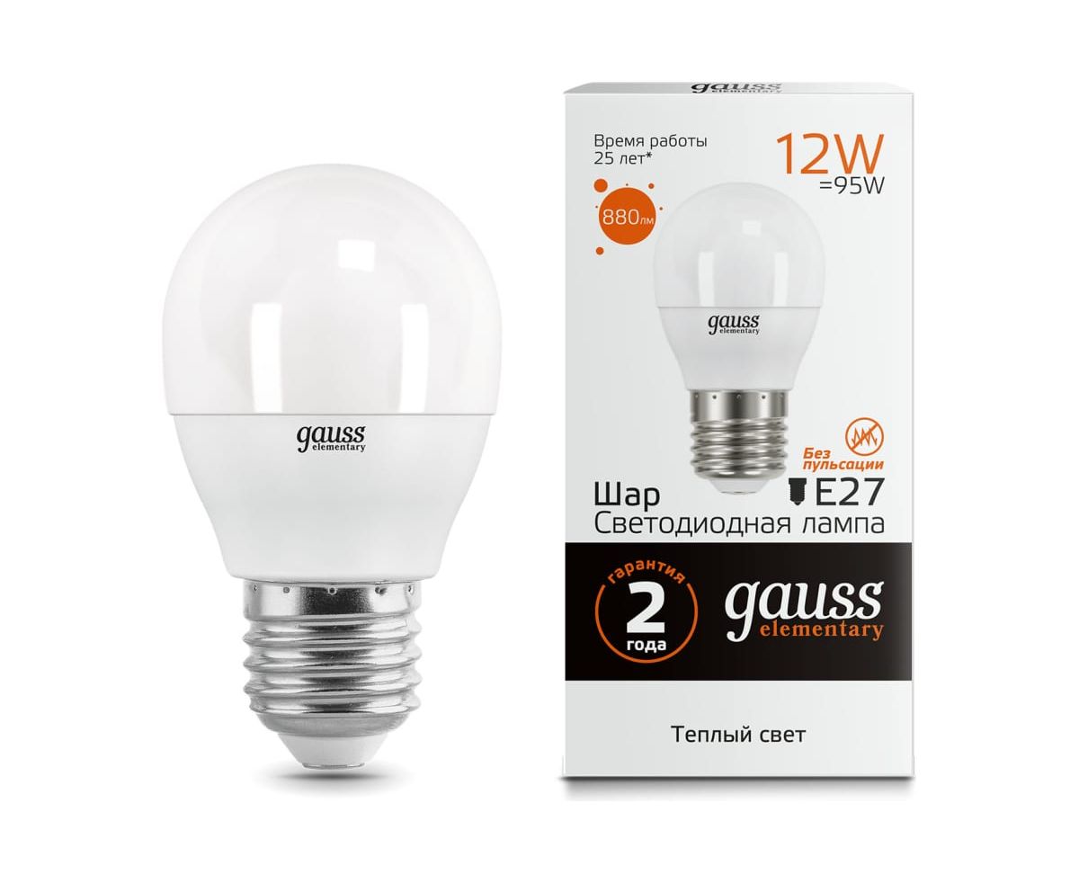 Светодиодная лампа Gauss Elementary Шар 12W 880lm 3000K Е27 LED 1/10/100 53212 является универсальным источником света для любого типа помещений. Матовая колба равномерно рассеивает свет и подходит для открытых светильников и прозрачных плафонов. За счет высокого индекса цветопередачи пространство будет наполнено приятным, мягкий светом, не слепящим глаза. В случае перебоя напряжений лампа не потеряет яркость и не будет мерцать.