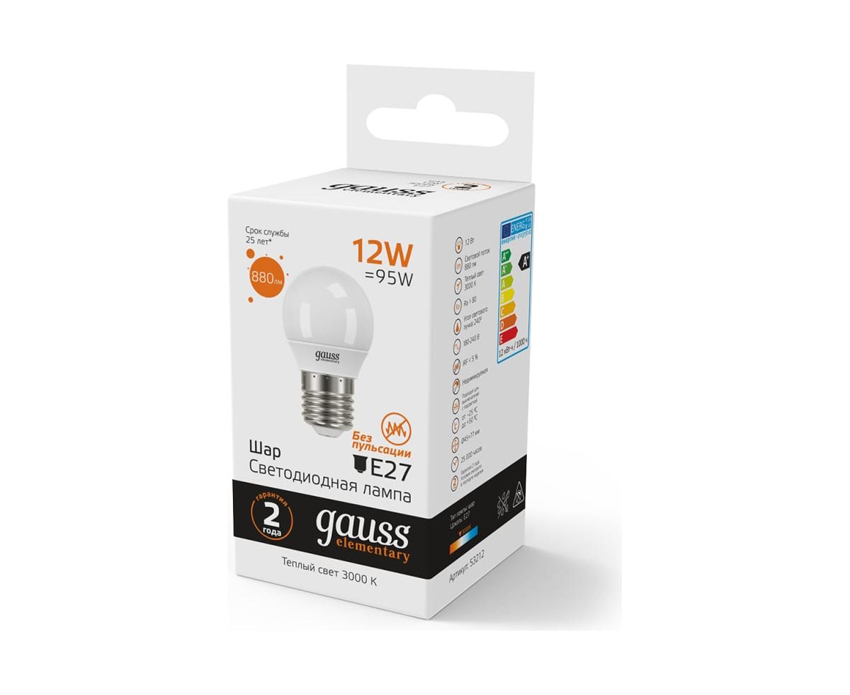 Технические характеристики Gauss LED Elementary Шар 12W 880lm 3000K Е27 LED 53212