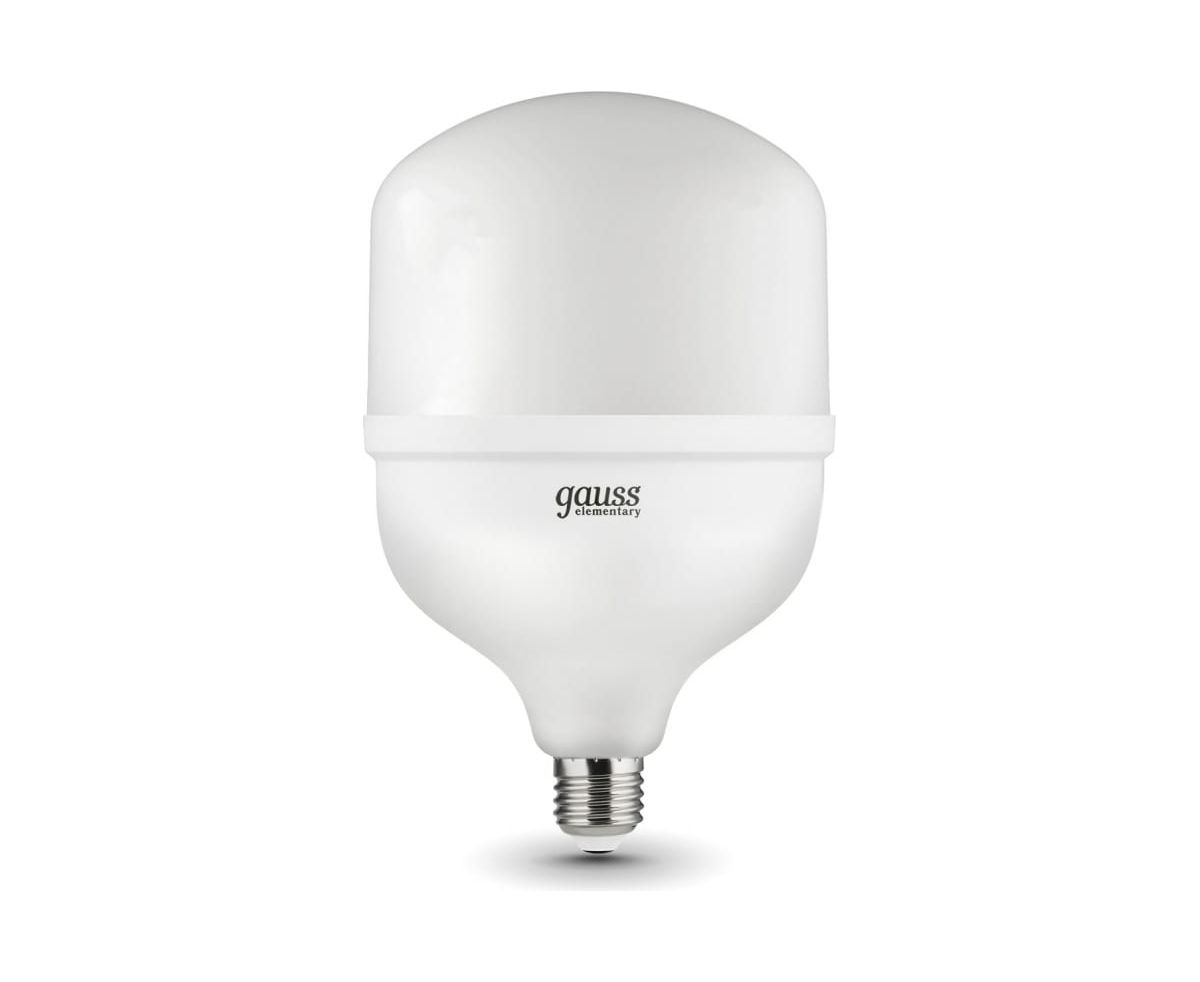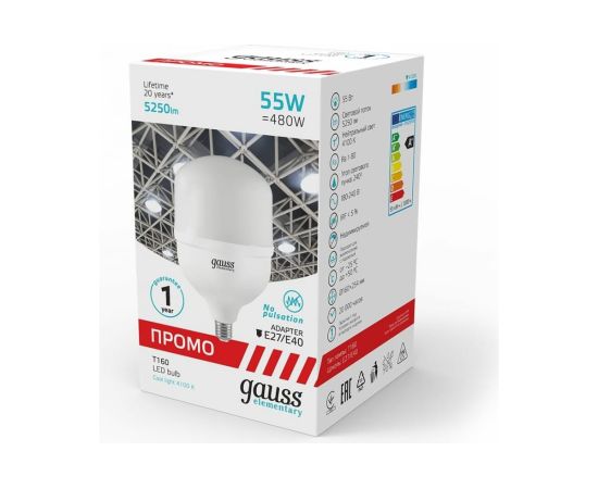 Лампа Gauss Elementary T160 55W 5250lm 6500K E27/E40 Promo LED 1/12 60436 высокой мощности используется в освещении помещений большой площади и высокими потолками (от 3,5 метров), а также уличных системах освещения. Высокая мощность и большой световой поток при минимальном энергопотреблении.