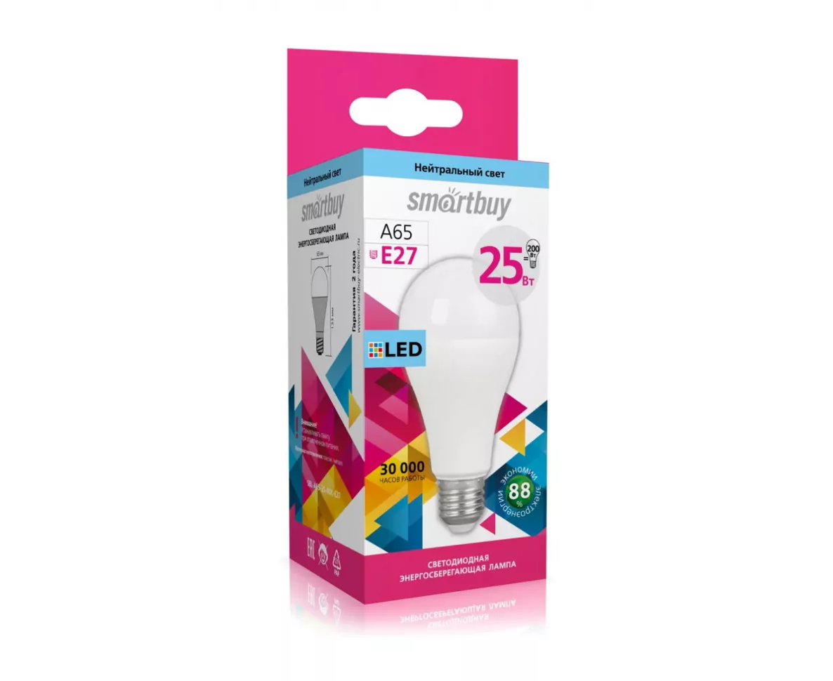 Лампа светодиодная SMARTBUY A65 25Вт 4000K E27 (нейтральный свет) (1/100)