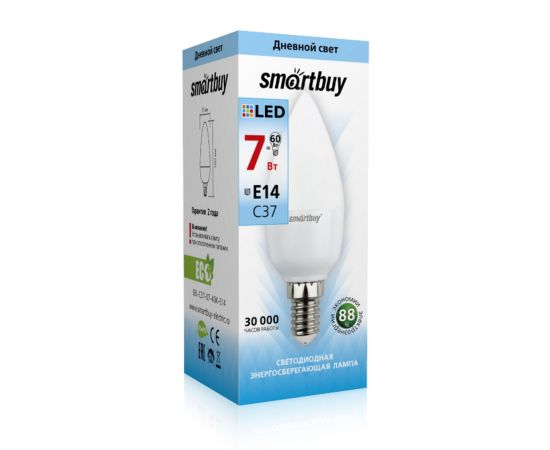 Лампа светодиодная SMARTBUY C37 7Вт 220V 4000K E14 (свеча, нейтральный свет) (1/10/50)