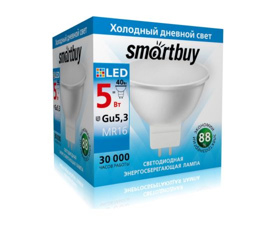 Лампа светодиодная SMARTBUY GU5.3 (MR16) 5Вт 220V 6000K (холодный, дневной свет) (1/10/50)
