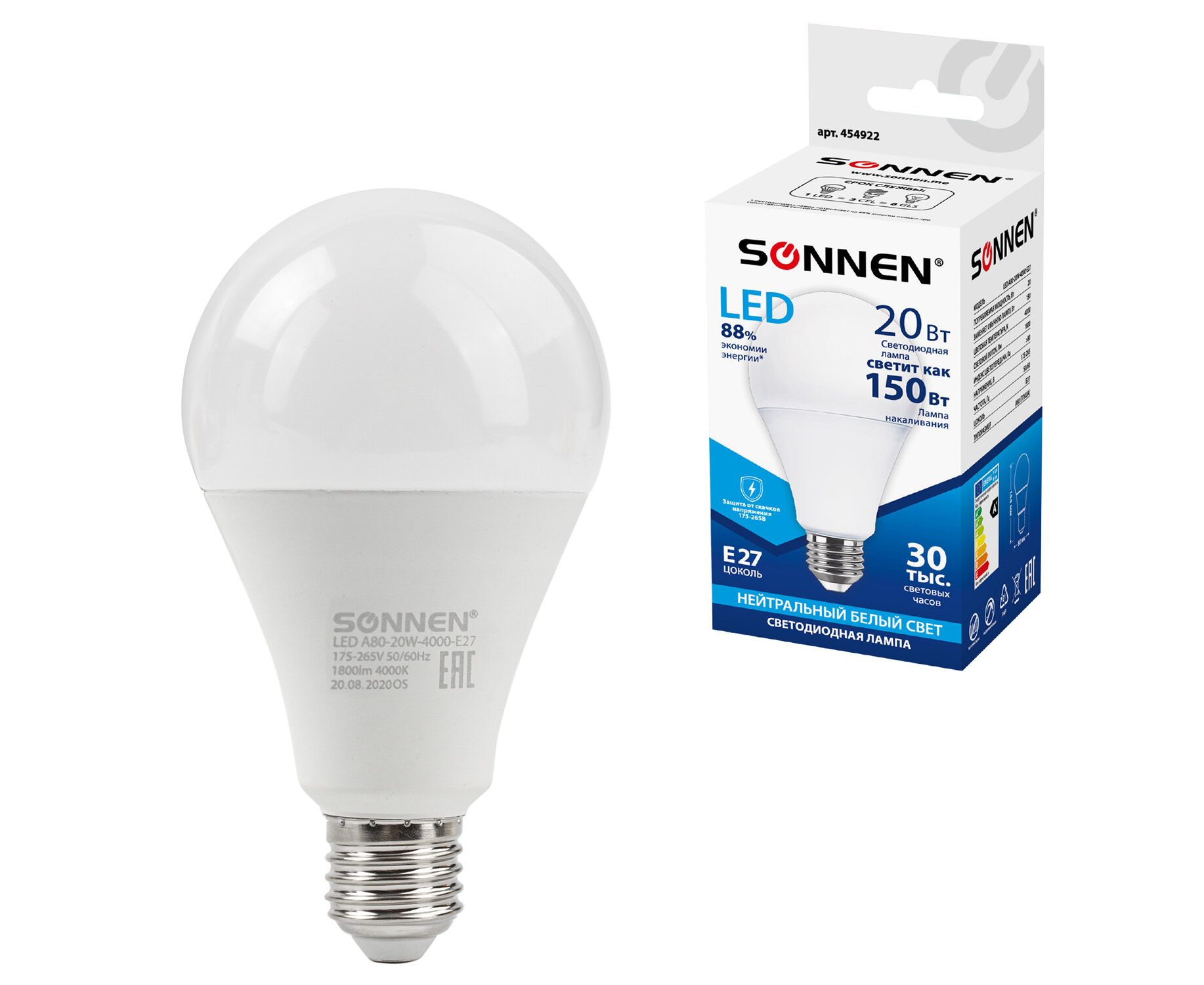 Лампа светодиодная Sonnen A80-20W-4000-E27 454922