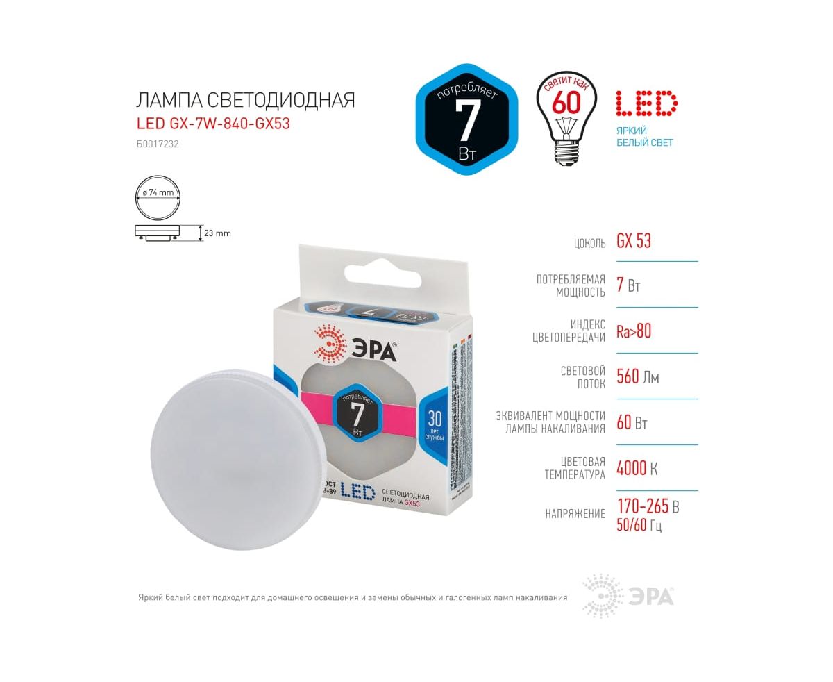 Технические характеристики ЭРА LED smd GX-7w-840-GX53 Б0017232