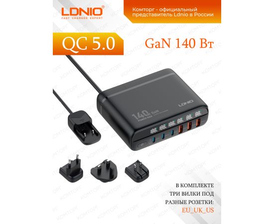 Сетевое зарядное устройство GaN LDNIO A6140C/ + LED дисплей/100W PD кабель/ PD+PPS+QC 5.0/ 6 USB/ Выход: 140W/ черный