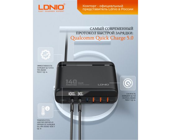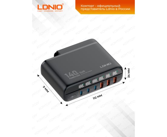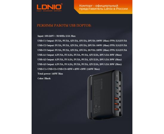 USB Type-A (1, 2, 3) - до 30W, что позволяет быстро и эффективно заряжать различные устройства. LDNIO A6140C также обеспечивает многоуровневую защиту от повышенного тока, напряжения и перегрева, обеспечивая безопасность использования. Корпус адаптера изготовлен из негорючего пластика, обеспечивающего безопасность и надежность в использовании.