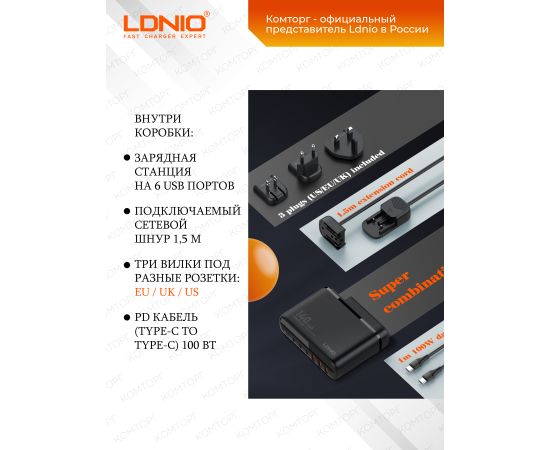 Важным преимуществом LDNIO A6140C является наличие в комплекте переходников (US, UK, EU), кабеля длиной 1 м Type-C-Type-C и удлинителя длиной 1,5 метра, обеспечивающих удобство использования в любой стране.