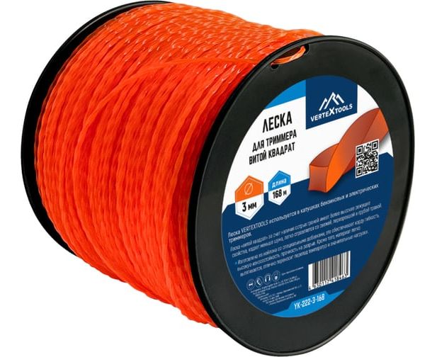 Леска 3 мм, бобина 168 м, витой квадрат для триммера vertextools YK-222-3-168