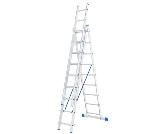 Алюминиевая трехсекционная лестница Сибртех 97819 состоит из 3-х секций по 9 ступеней каждая. Она предназначена для использования преимущественно на открытом воздухе и в помещениях с высокими потолками, подойдет также для работников коммунальных служб и строителей. Лестница поможет провести отделочные, монтажные работы, будет полезна на складе. Преимущества: Надежность и долговечность — рама изготовлена из прессованного алюминиевого профиля прямоугольного сечения, весит намного меньше стальных аналогов, при этом обладает прочностью и коррозионной стойкостью. Допустимая нагрузка 150 кг — лестница способна выдержать вес практически любого пользователя. Многофункциональность — лестница может использоваться в 3-х различных вариациях — в качестве стремянки (с двумя расставленными и одной выдвинутой вверх секцией), двухсторонней стремянки (две секции расставлены, третья демонтирована) и приставной лестницы. Пластиковые заглушки — края профиля не царапают напольное покрытие независимо от выбранного положения лестницы. Устойчивость — лестница оснащена съемным стабилизатором, выравнивающим ее положение на горизонтальных поверхностях. Безопасная эксплуатация — на ступени нанесено антискользящее покрытие, имеется ограничитель по максимальной высоте. Простое применение — сборка, разборка и смена рабочих положений не занимает много времени. Компактное хранение и удобная транспортировка — в сложенном виде лестница не занимает много места.