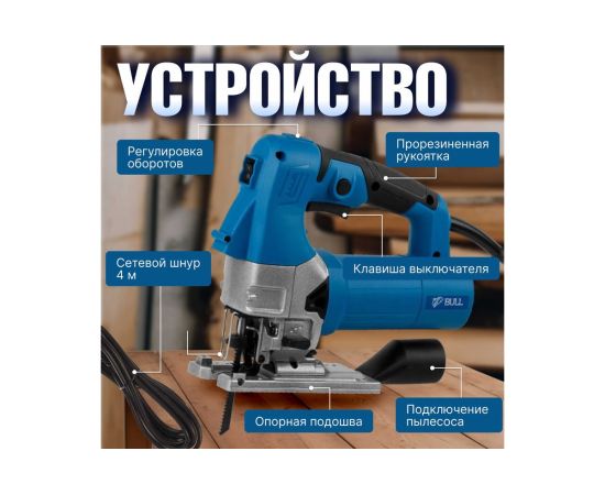 Электролобзик BULL ST 1301 (20046329) оснащен удобной, эргономичной прорезиненной рукояткой. Наличие маятникового движения с направляющим роликом позволяет производить быстрые и при этом ровные пропилы. Литая алюминиевая подошва регулируется под разными углами. Есть защитная пластиковая накладка для подошвы. Возможно подключение пылесоса. Регулировка скорости позволяет использовать лобзик для реза различных материалов. Лобзик также оснащен подсветкой. Удобству работы способствует длинный резиновый кабель.