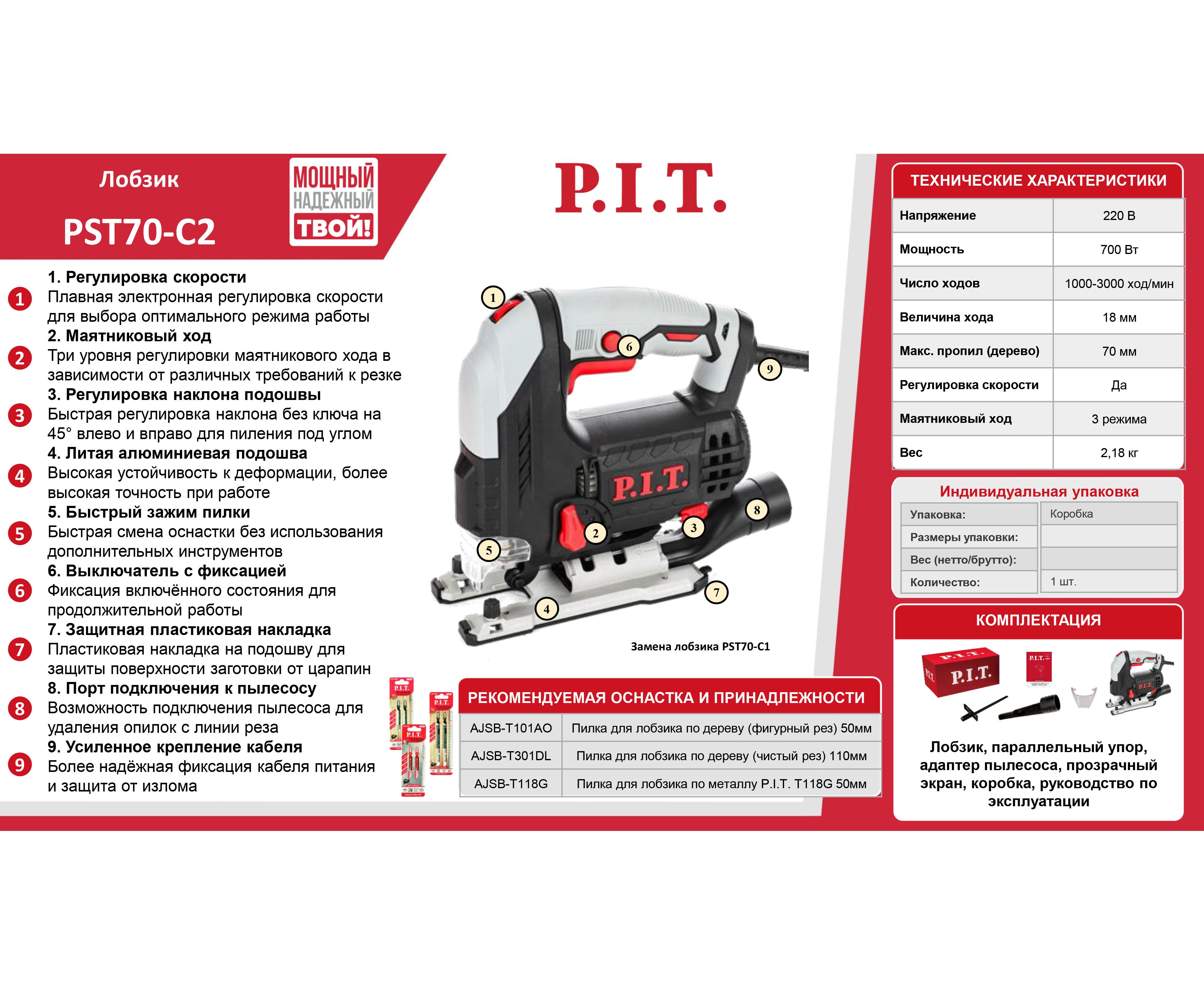 Обновлённая версия отлично зарекомендовавших себя лобзиков PIT. Обновленный дизайн, улучшенная эргономика, долгий срок службы. Электрический лобзик PST70-C2 отлично подойдет для прямых, наклонных и криволинейных распилов различных материалов: дерева, деревосодержащих композитных материалов, панелей, пластика, металла.