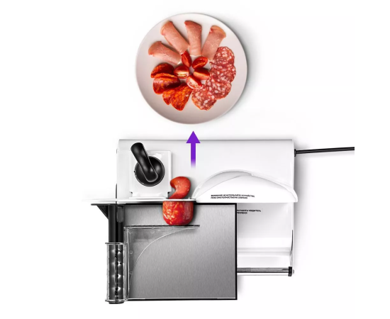 Готовые ломтики выходят через выходное отверстие. Под него рекомендуется установить поднос или тарелку, чтобы удобно собирать нарезанные ингредиенты и сохранить чистоту рабочей поверхности.