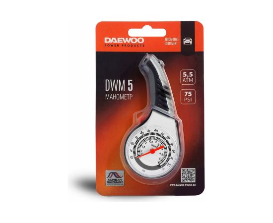 Аналоговый манометр DAEWOO DWM5 DWM 5 предназначен для измерения давления в шинах. Рабочий диапазон составляет 0.5-5.5 ATM и 10-75 PSI. Изделие оснащено кнопкой сброса показаний, а также клапаном для стравливания давления. Температурный режим эксплуатации: от -50 до +50°С.