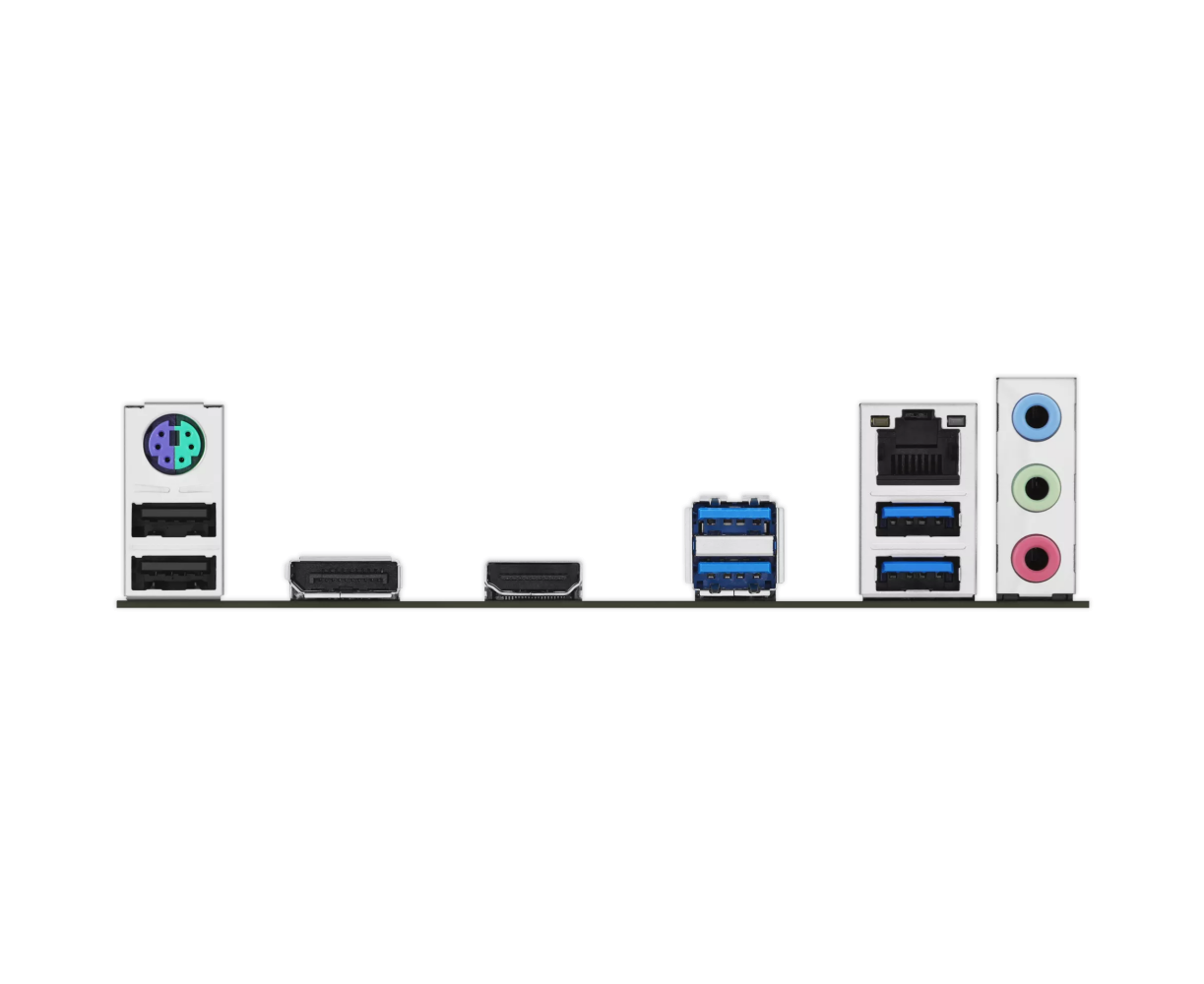 PS/2, 2 x USB 2.0, 4 x USB 3.2 Gen1, HDMI, DisplayPort, RJ-45