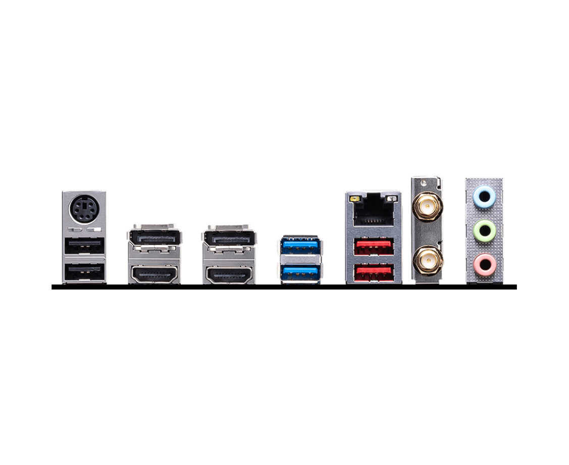 PS/2, 2 x USB 2.0, 2 x USB 3.2 Gen1, 2 x USB 3.2 Gen2, 2 x HDMI, 2 x DisplayPort, RJ-45