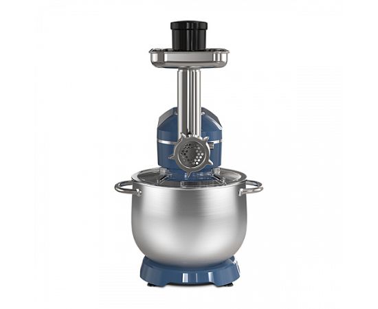 Планетарный миксер, чаша, крышка чаши, металлический венчик для взбивания, крюк для замешивания теста, насадка для смешивания, мясорубка, 3 диска для приготовления фарша, толкатель мясорубки, руководство по эксплуатации, гарантийный талон