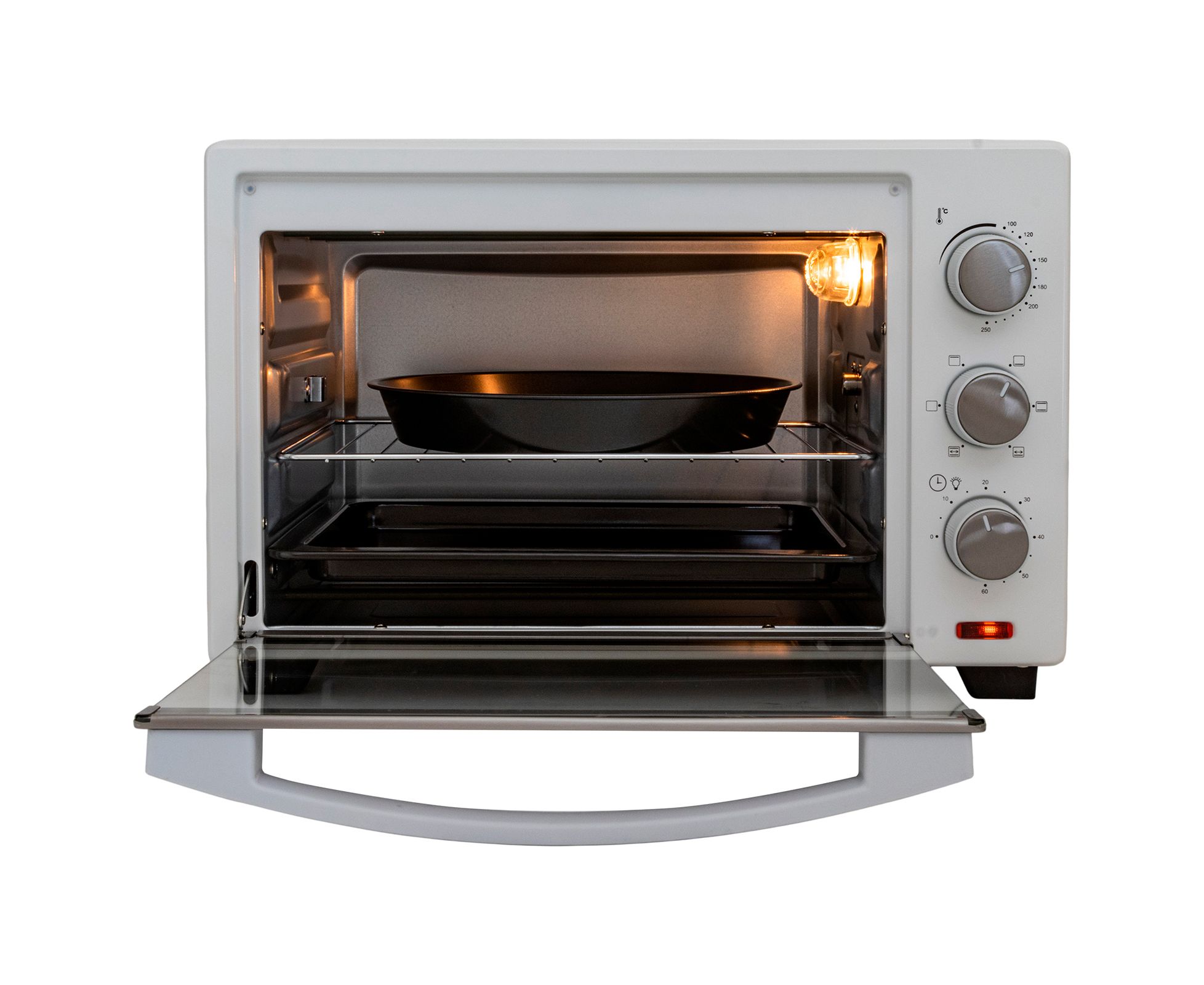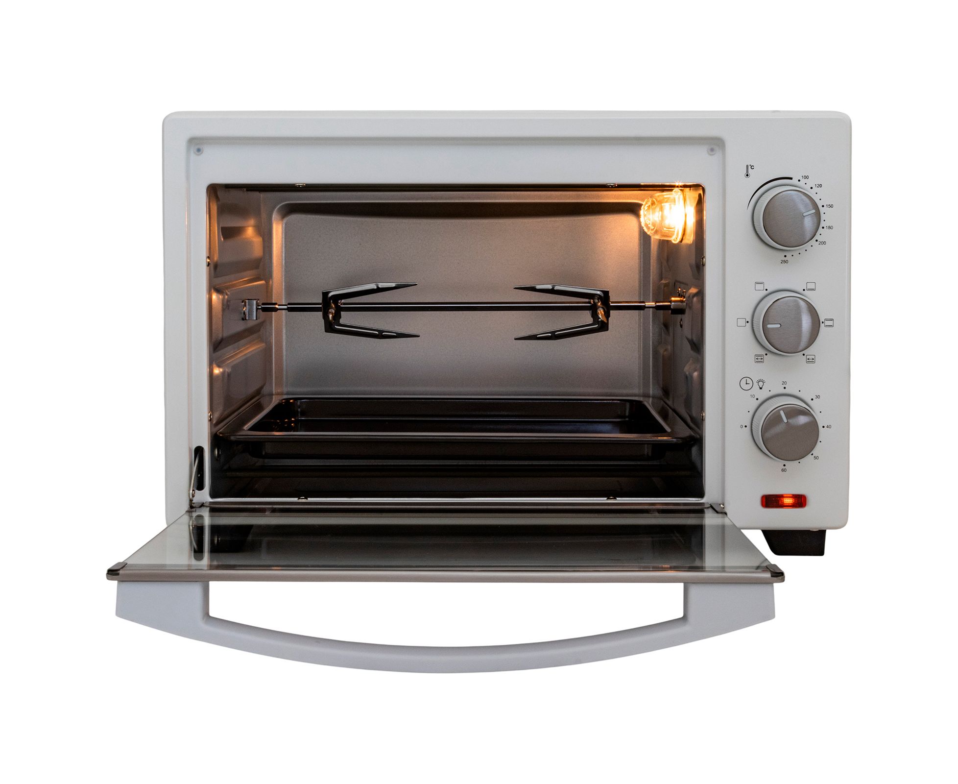 электропечь, металлическая решетка, плоский противень, круглая форма для пиццы, ухват для противня, вертел, ухват для вертела, инструкция на русском языке