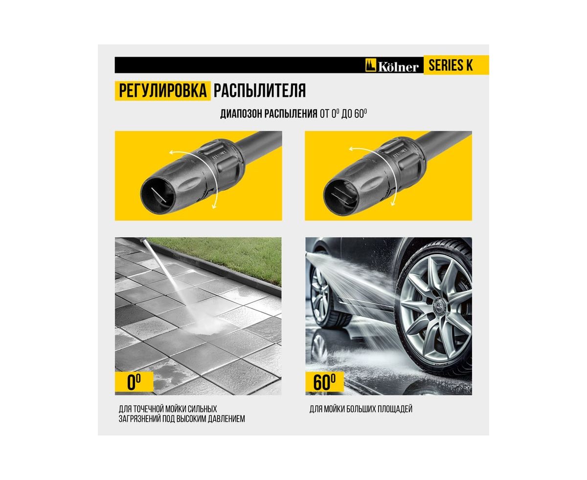 - Регулировка распылителя: Позволяет адаптировать форму струи от мощной до веерной с углом до 60°, обеспечивая гибкость в выполнении различных задач по очистке