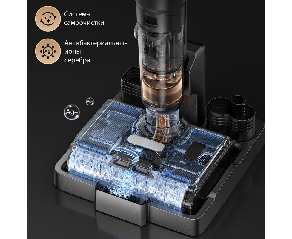 Преимущества Мощность всасывания 100 аВт, Самоочистка и сушка горячим воздухом, Съемный аккумулятор, Двигатель IPX8 мощностью 400 Вт, Комплектация 3 в 1, Портативная конфигурация для уборки мебели