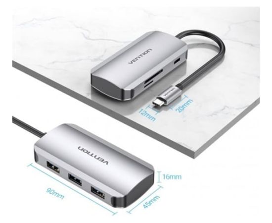 Мультифункциональный хаб VENTION USB-C > USB 3.0x3/SD/TF/PD TNHHB позволяет увеличить количество разъемов на вашем устройстве с разъемом USB Type C. Хаб оснащен разъемами для считывания карт памяти с максимальным объемом считывания карт памяти до 256 Гб. Также благодаря 3 разъемам USB 3.0, одновременно можно подключать, или заряжать до 3 устройств на оборудовании с разъемом USB Type C, а разъем USB Type C можно использовать для быстрой зарядки устройств с мощностью до 100 Ватт. Корпус из высокопрочного алюминия предает хабу презентабельный внешний вид, максимально полезный отвод избыточного тепла и обеспечит надежную защиту от внешних воздействий в процессе эксплуатации. Поддерживает стандарт USB OTG. Поддерживает технологию Plug and Play, тем самым, не требуя установки дополнительного программного обеспечения и драйверов.