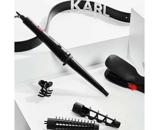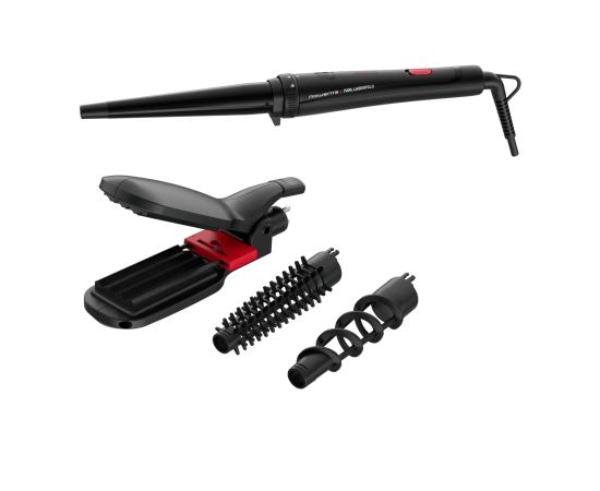 Комплектация Коническая плойка, защитная перчатка, щипцы и выпрямляющие пластины, спиральная щетка, пластиковая щетка, 2 кусачки, ручка, чехол