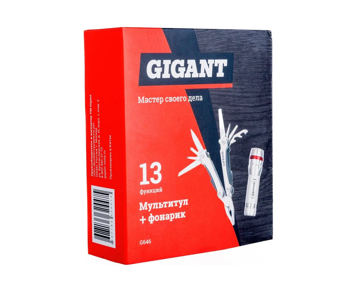 Набор мультитул Gigant 2 предмета G646 состоит из многофункционального инструмента и фонарика. Материал корпуса фонаря - сталь в сочетании с пластиком. Источником питания являются батареи типа ААА.