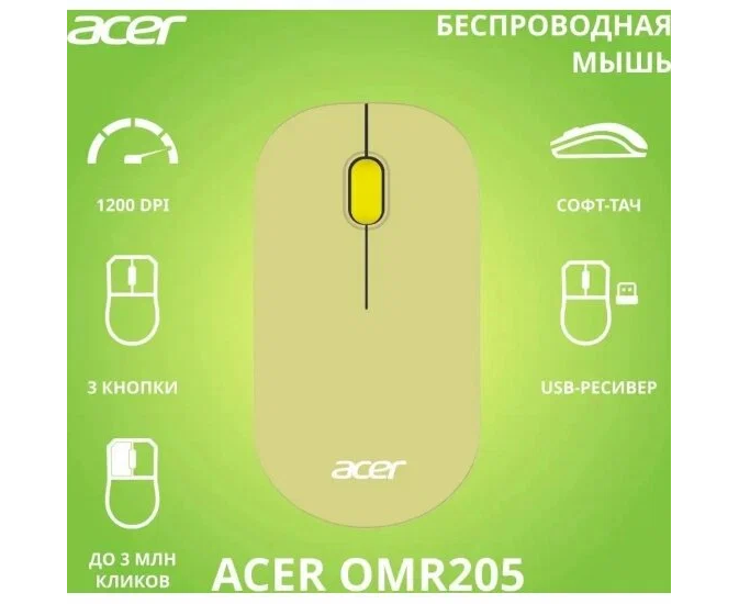 Мышь Acer OMR205 зеленый/желтый оптическая (1200dpi) беспроводная USB для ноутбука (2but)