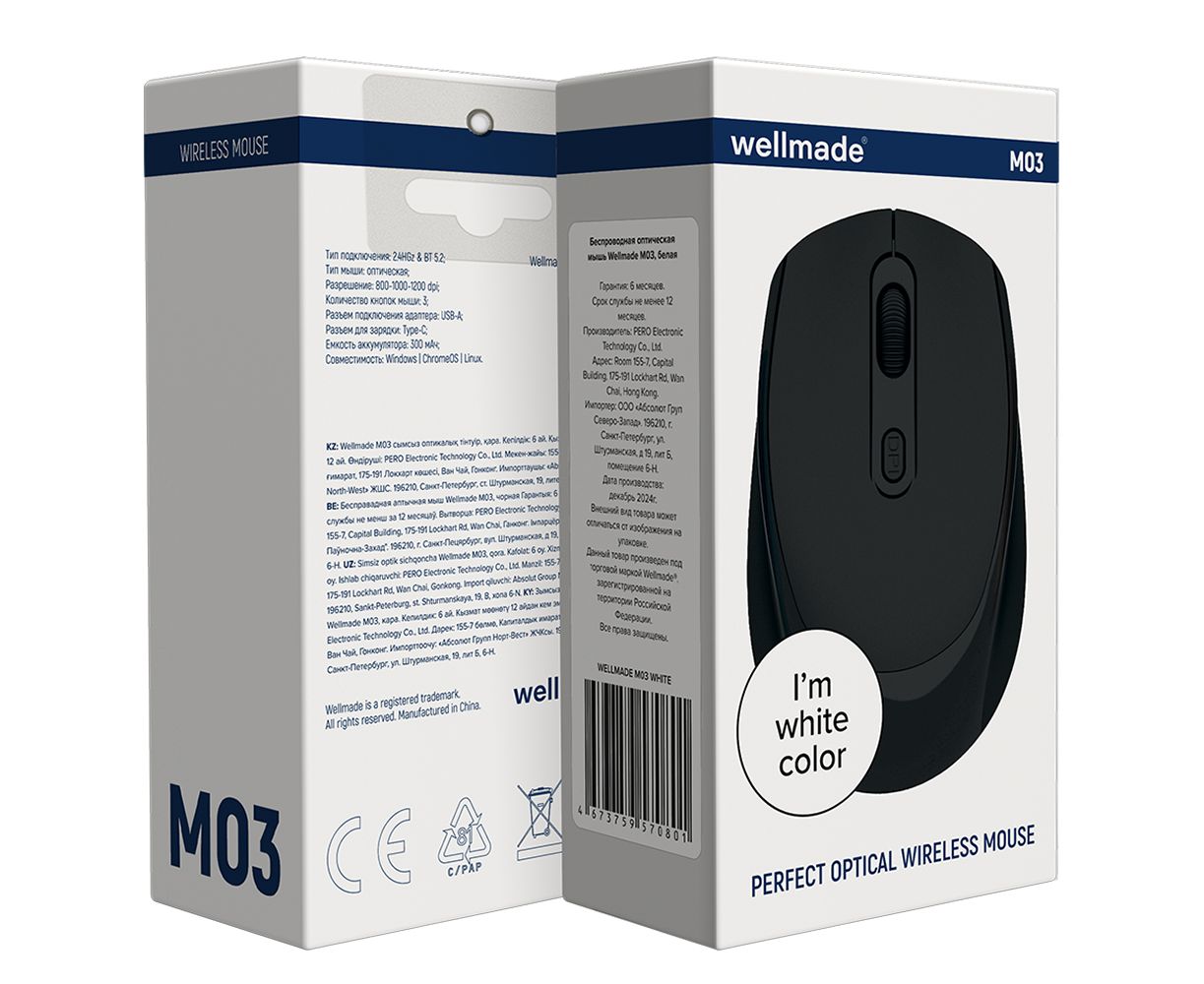 Беспроводная оптическая мышь WELLMADE M03 с разрешением до 1200 dpi и радиусом действия до 10 метров. Совместима с Windows, ChromeOS, Linux. Тип подключения: 2.4ГГц и BT 5.2. Разъем подключения адаптера: USB-А. Разъем для зарядки: Type-C. Размер устройства: 100х37х63мм. Цвет:голубой.
