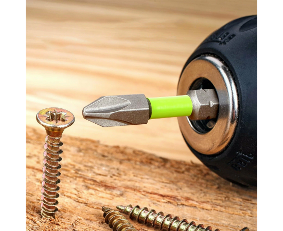 Биты изготовлены из хромованадиевой стали S2. Биты 50 мм имеют торсионную зону для компенсации избыточного крутящего момента и сохранения рабочей зоны метиза и биты.