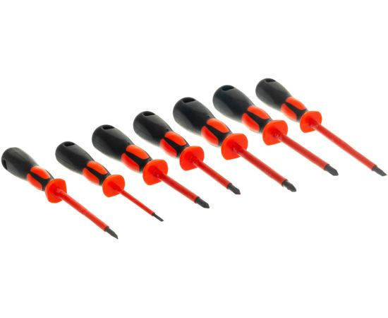Набор диэлектрических отверток применяется для работы с крепежом, имеющим паз PH, PZ либо SL под напряжением до 1000 В. Специальные вставки из резины на рукоятках способствуют более надежному удержанию инструмента без проскальзывания. Стержни изготовлены из хром-молибденовой стали и способны выдерживать большие нагрузки.