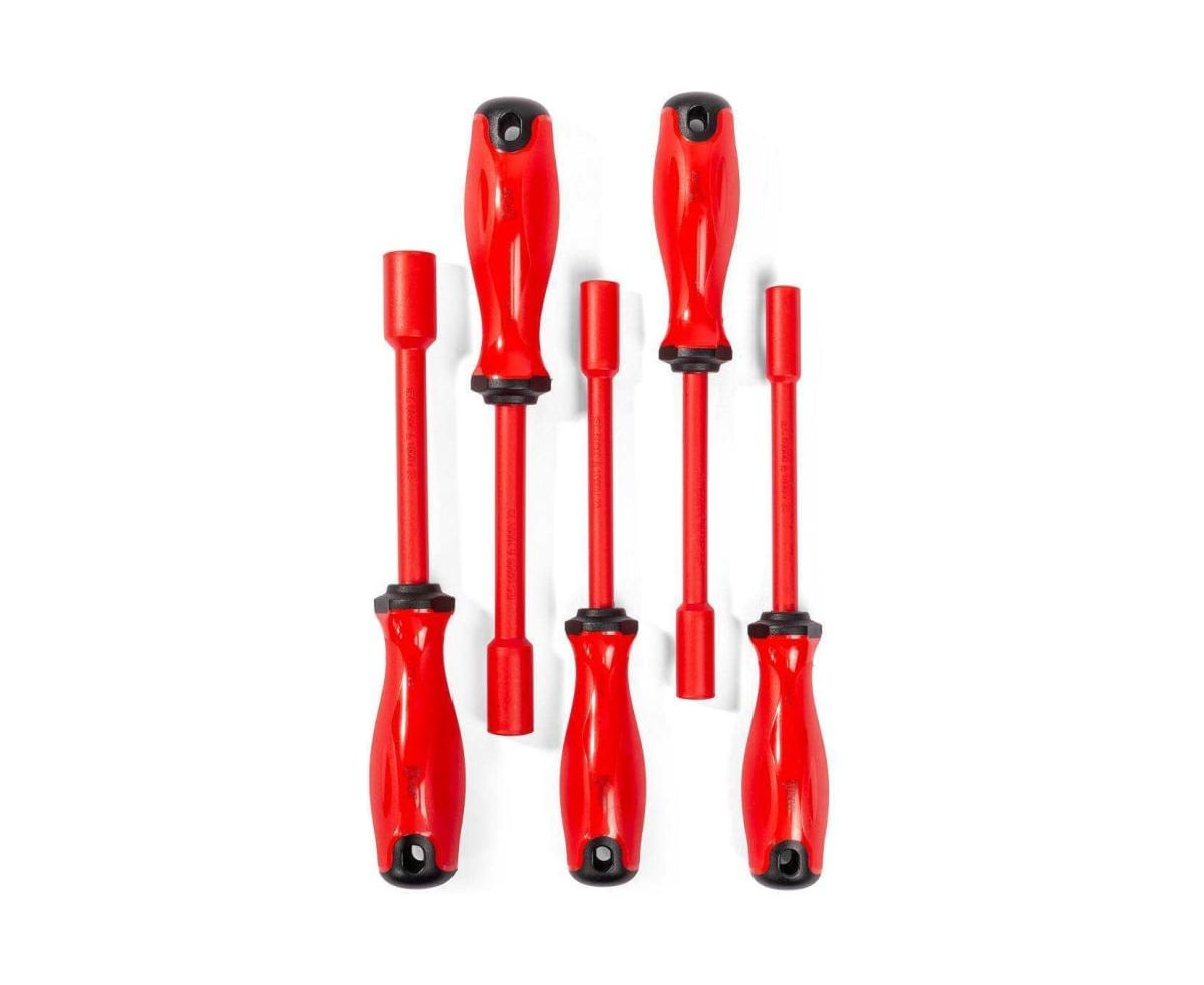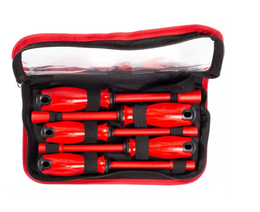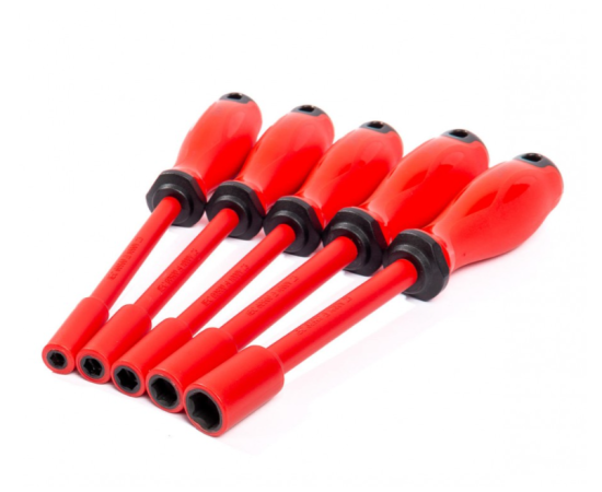 Набор торцевых диэлектрических отверток предназначен для работы по монтажу и демонтажу гаек и болтов с шестигранной головкой под напряжением до 1000 В. Инструменты выполнены из хромомолибденовой стали, что делает их надежными и долговечными. Двухкомпонентные нескользящие рукоятки с защитой от скатывания обеспечивают комфортное использование.