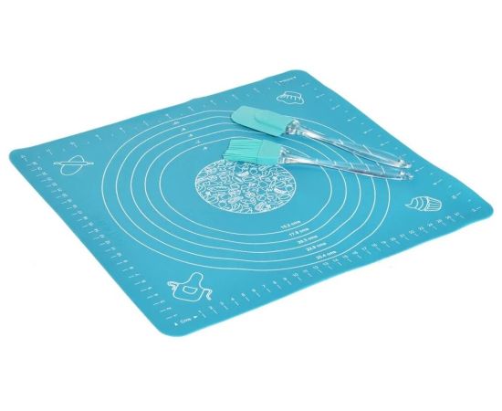3 предмета: - кисточка (18*3 см), 13 гр- лопатка (17*3 см), 15 гр- коврик для раскатки теста однотонный, с разметкой (30*33 см, толщина 0,6 мм), 85 гр. Лопатка гибкая предназначена для равномерного распределения крема, масла, соуса или начинки. Кисточка предназначена для смазывания поверхностей посуды, а также продуктов перед запеканием или жаркой. Температура использования от -60°С до +260°С