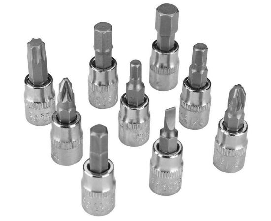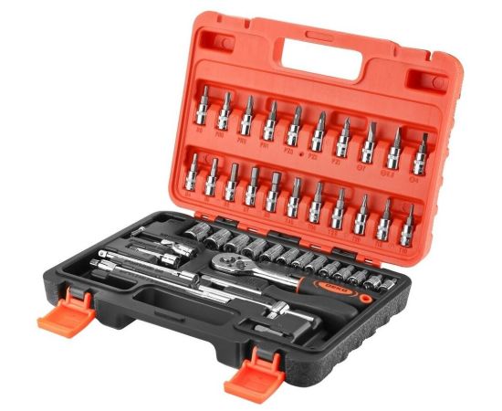 1/4'': 4, 4,5, 5, 5,5., 6, 7, 8, 9, 10, 11, 12, 13, 14 мм; головки со вставками: SL: 4, 5.5, 7 мм; PH: 1, 2, 3 мм; PZ: 1, 2 мм; T: 10, 15, 20, 25, 30, 40 мм; H: 3, 4, 5, 6, 7, 8 мм; шарнир карданный для головок, вороток для головок 105 мм, удлинители для головок 50 и 100мм, трещотка 150 мм, гибкий удлинитель для головок 150 мм