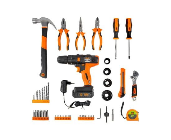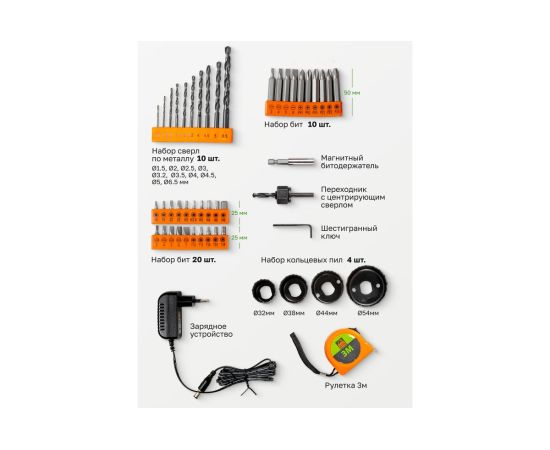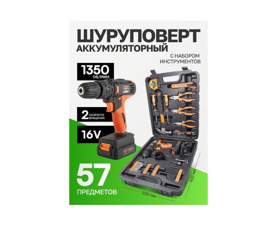 Надежная и производительная аккумуляторная дрель шуруповерт с набором сверл и кольцевых пил станет отличным подарком домашнему мастеру, дачнику и владельцу загородного коттеджа. Набор инструментов из 57 предметов в кейсе комплектуется самим шуруповертом на 16 Вольт, несколькими отвертками, молотком, плоскогубцами, кольцевыми пилами, сверлами и остальными нужными инструментами для монтажа. Для удобства хранения и использования набор инструментов отпускается в красивом эргономичном кейсе из пластика. Рекомендуемая первая зарядка аккумулятора для дрели-шуруповерта 24 часа.